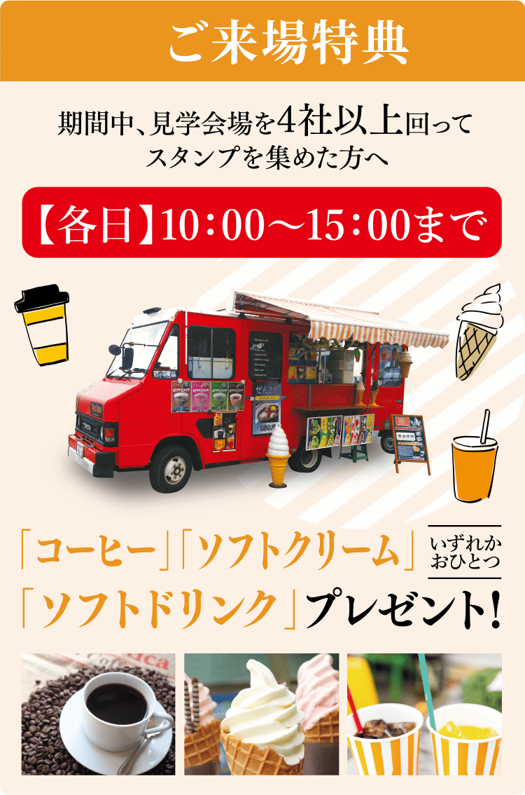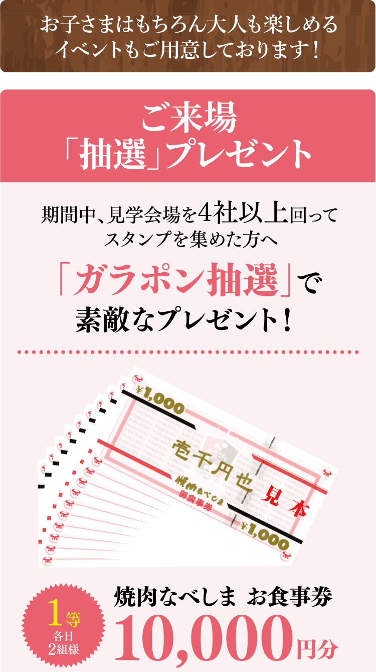 ※期間中、見学会場を4社以上回って、アンケートにご記入いただいた方を対象とさせていただきます。※未成年の方のみの来場は対象外とさせていただきます。※1家族・1組様1回限り。※数に限りがございます。無くなり次第終了させていただきます。※写真・イラストはイメージです。