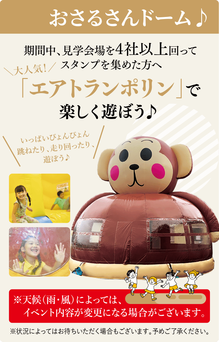 【ご来場抽選プレゼント・おさるさんドーム♪・ご来場特典について】※期間中、見学会場を4社以上回って、アンケートにご記入いただいた方を対象とさせていただきます。※未成年の方のみの来場は対象外とさせていただきます。※1家族・1組様1回限り。※数に限りがございます。無くなり次第終了させていただきます。※写真・イラストはイメージです。